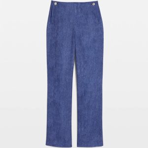A lightweight fabric with a denim print gives these flowy trousers a fashion edge. Designed with a Hollywood waist and side zipper for a flattering look, the side slant pockets are adorned with crest buttons. Pair with our coordinating Denim Print Chiffon Halter Top.