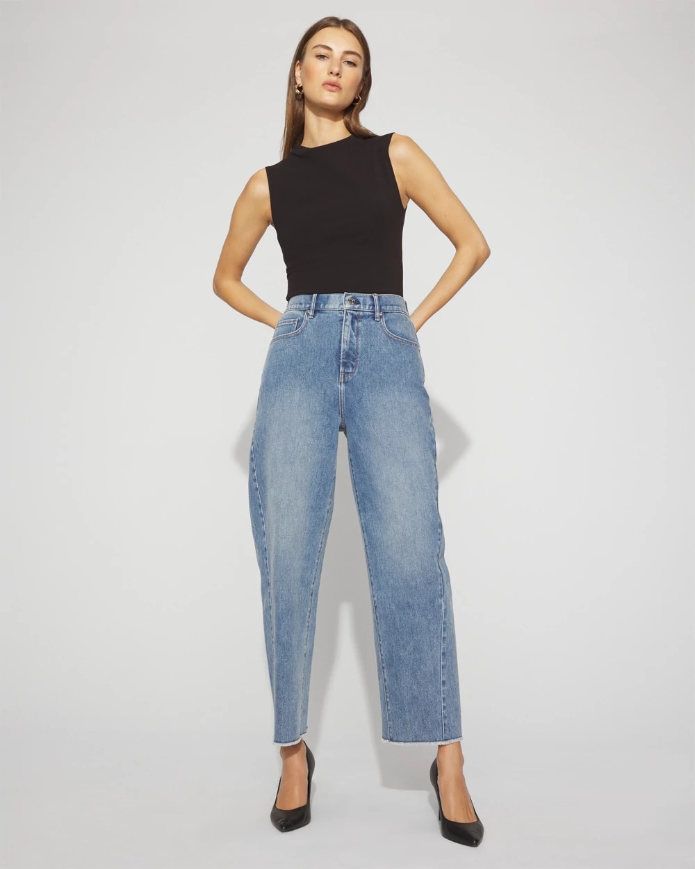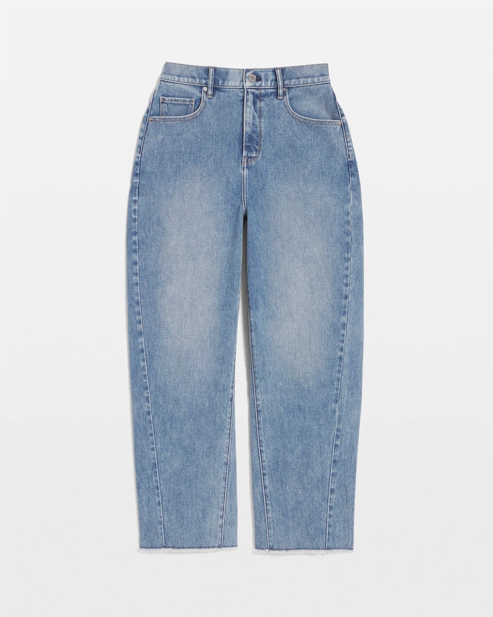 Our fashion forward barrel silhouette has an extra high-rise waist that flatters everyone. Style with boots, heels or sneakers and your favorite tee and jacket.