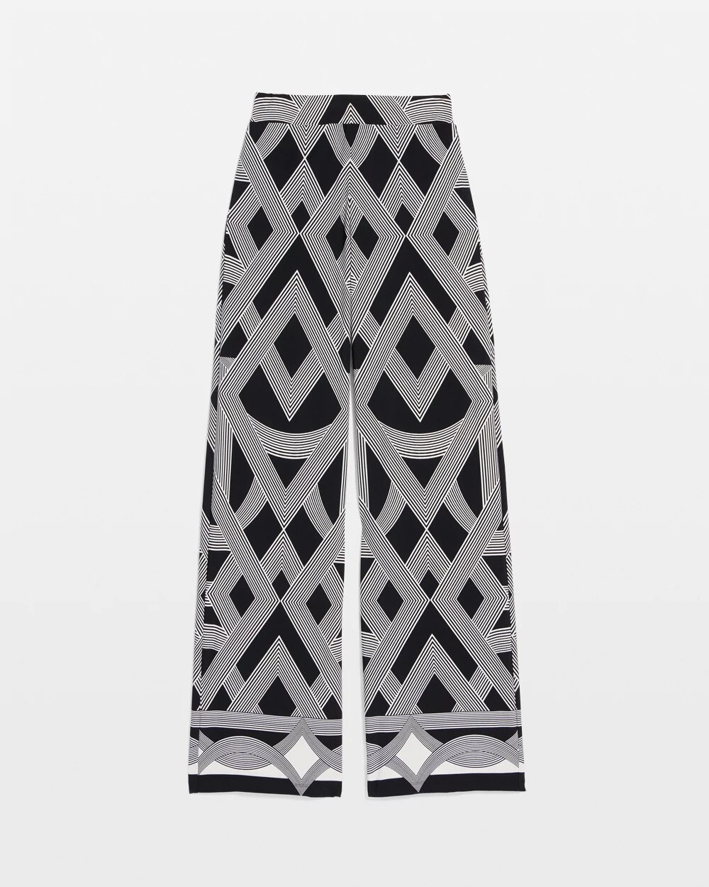 These statement making pants are cut from soft matte jersey, which gives you ease and a flattering drape. The bold geometric print with a border on the hem is also eye-catching chic. Pair with its match back top to complete the look.