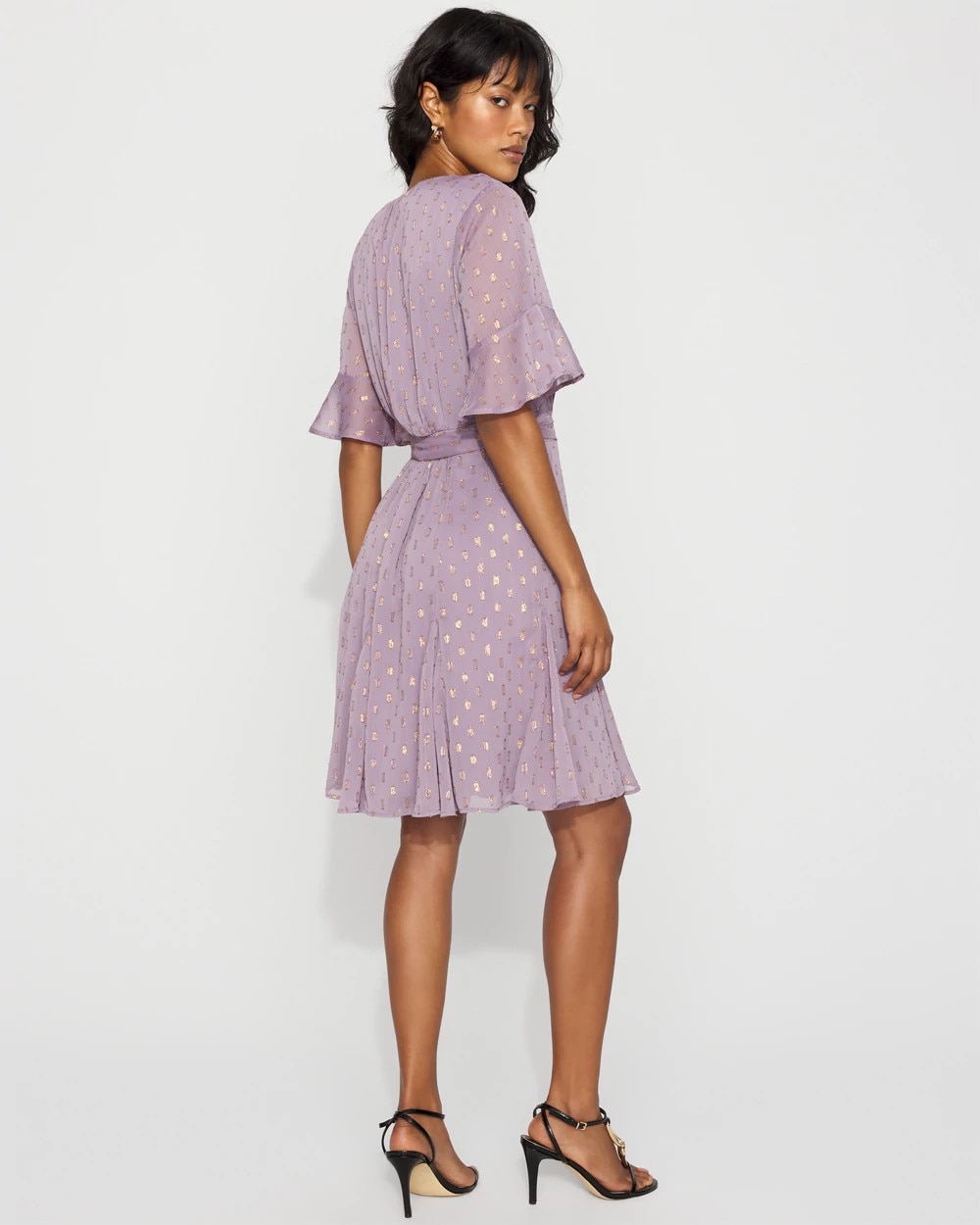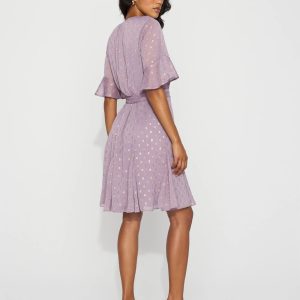 Dress for work or play in stunning dress crafted from a chiffon fabric with metallic clip dots for shine. The Godet pleats at the hem are a flirty detail that moves with you. The elbow sleeves and V-neck allow you to get creative with accessories. The tie-waist is removable.