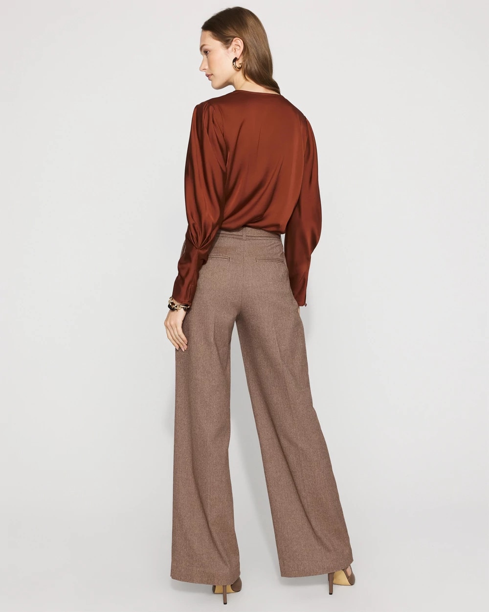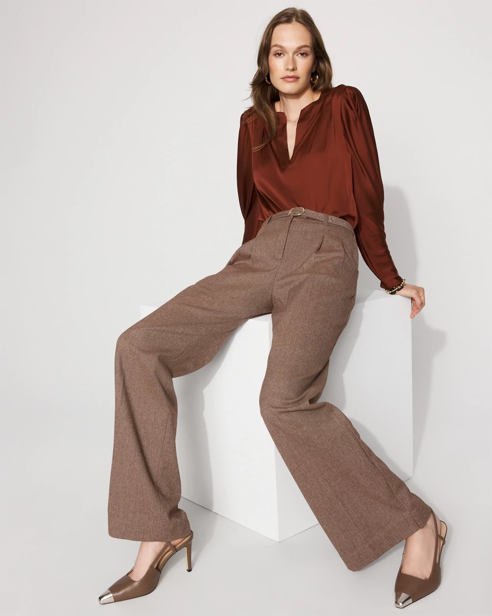 Fall outfitting just got easier with these pleated wide-leg pants cut from a classic tweed fabric. A detachable belt is designed with a gold buckle for a hint of shine.