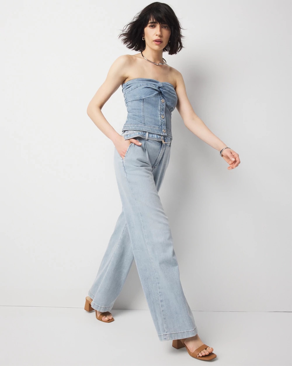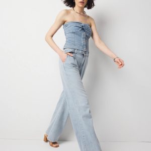 We designed this jean with classic trouser elements including front pleats, welt pockets and a relaxed wide-leg silhouette. We added a self-belt with gold D-ring and contrast stitching. A polished look cut from lightweight denim that is ideal for summer.