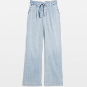 We designed this jean with classic trouser elements including front pleats, welt pockets and a relaxed wide-leg silhouette. We added a self-belt with gold D-ring and contrast stitching. A polished look cut from lightweight denim that is ideal for summer.