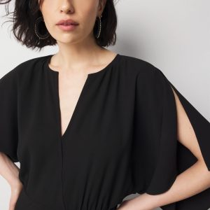 Cue the red carpet, this stunning gown gives us Old Hollywood vibes. Designed with kimono sleeves with a plunging V-neck, this maxi dress has lots of flowy movement thanks to the drapey crepe fabric. The perfect look for any formal or dressy occasion.
