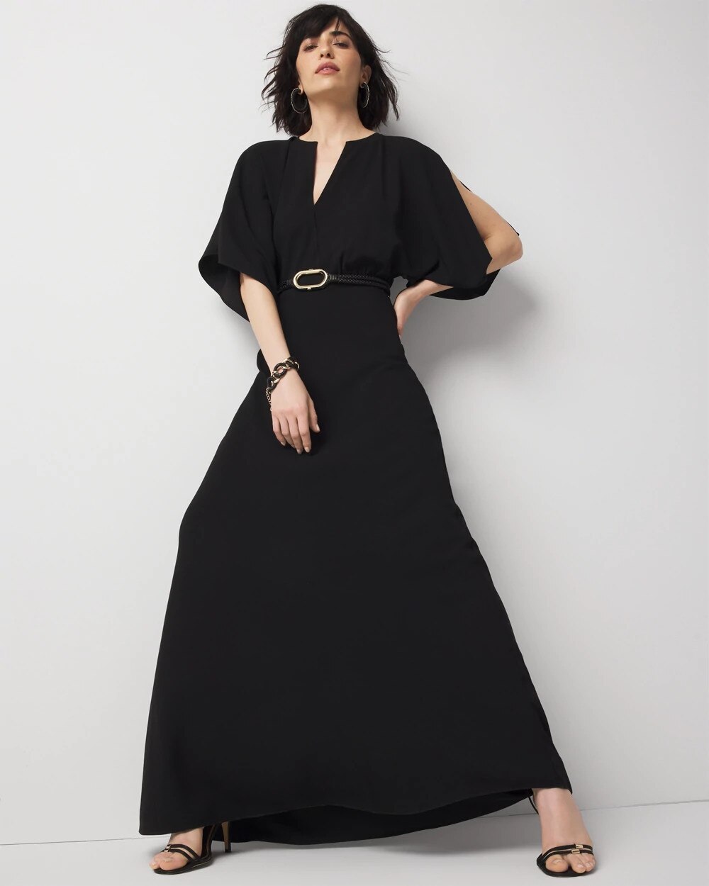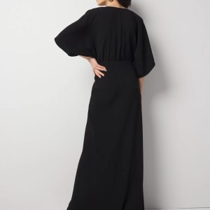 Cue the red carpet, this stunning gown gives us Old Hollywood vibes. Designed with kimono sleeves with a plunging V-neck, this maxi dress has lots of flowy movement thanks to the drapey crepe fabric. The perfect look for any formal or dressy occasion.