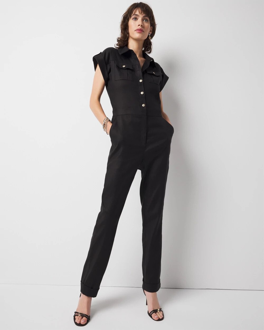 Petite Linen-Blend Short-Sleeve Utility Jumpsuit