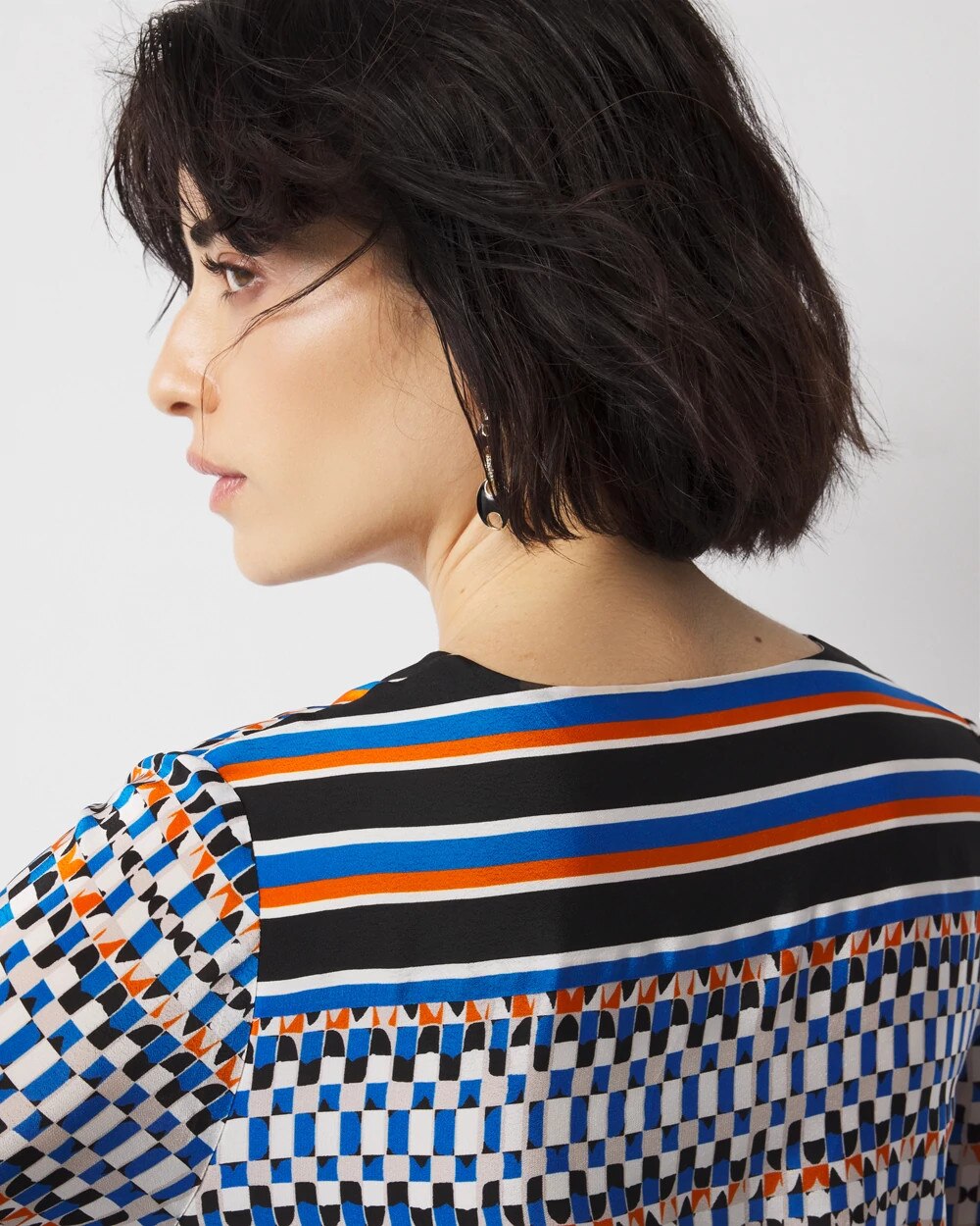 Made from a lightweight crepe fabric, this surplice dress has a removable tie belt and an elastic waist. And easy to wear and accessorize look for the office.