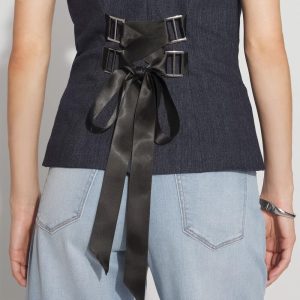 Crafted from a denim-look fabric, this vest has grosgrain ribbons that lace up at the back and are adjustable to customize fit. Faux pockets, three-button front closure and a notched lapel add a polished finish to the look. Pair with our matching Button Skort.