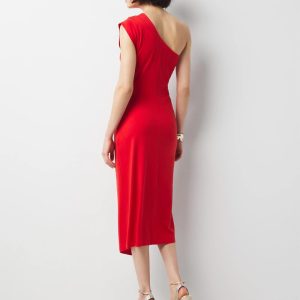Up the glam factor at your next party with this red-hot one-shoulder bodycon knit dress. Ruching on one side and at the shoulder emphasize your figure, and a front slit and asymmetric hem are modern details. Heels are a must, as is attitude.