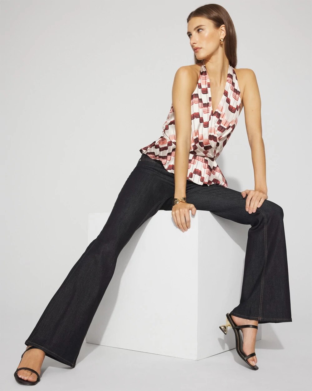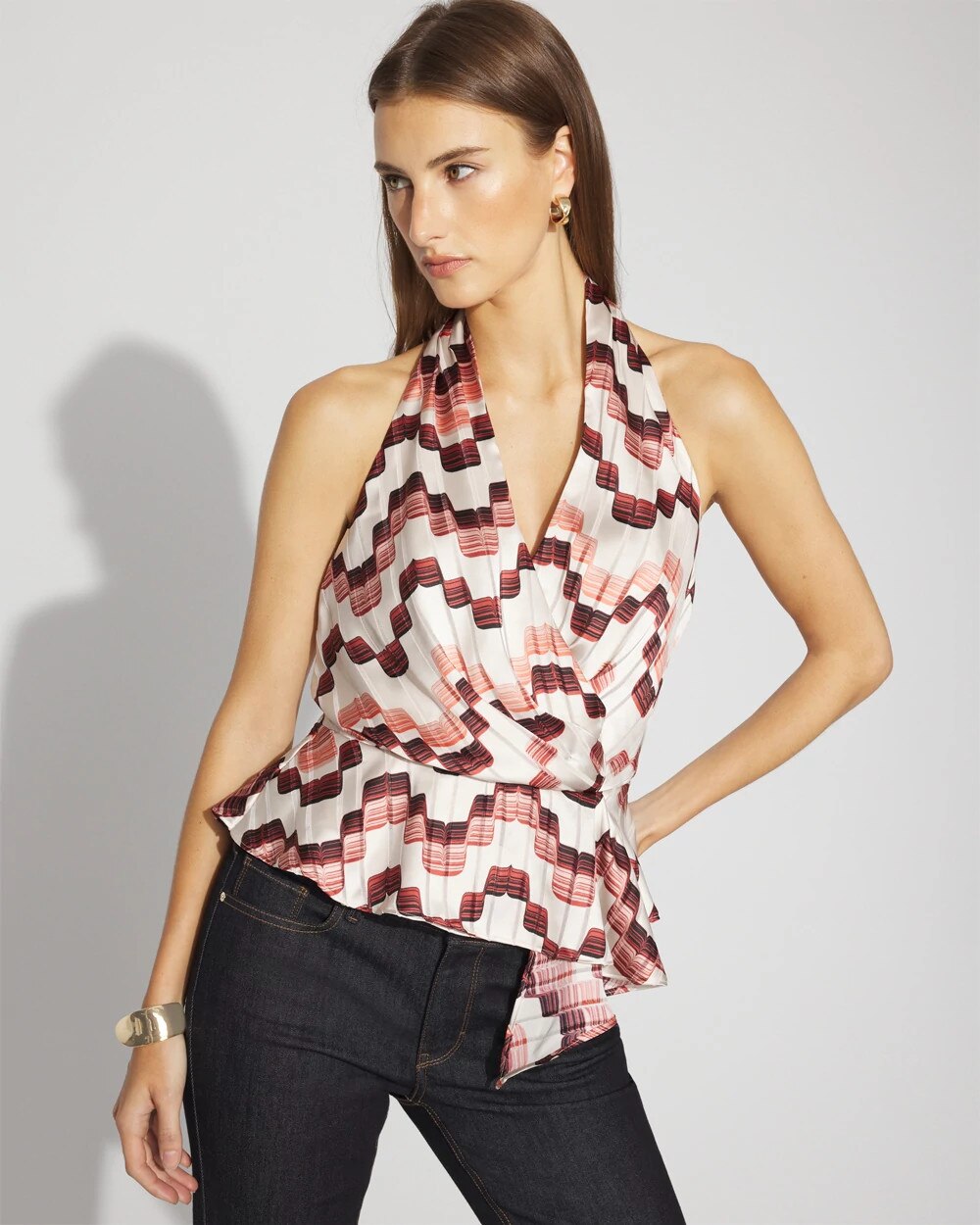 Instantly elevate your denim or shorts with this satin halter top. A surplice neckline is secured with a hook in front, and the fabric extends into an asymmetric peplum hem. Gripper tape ensures a secure fit.