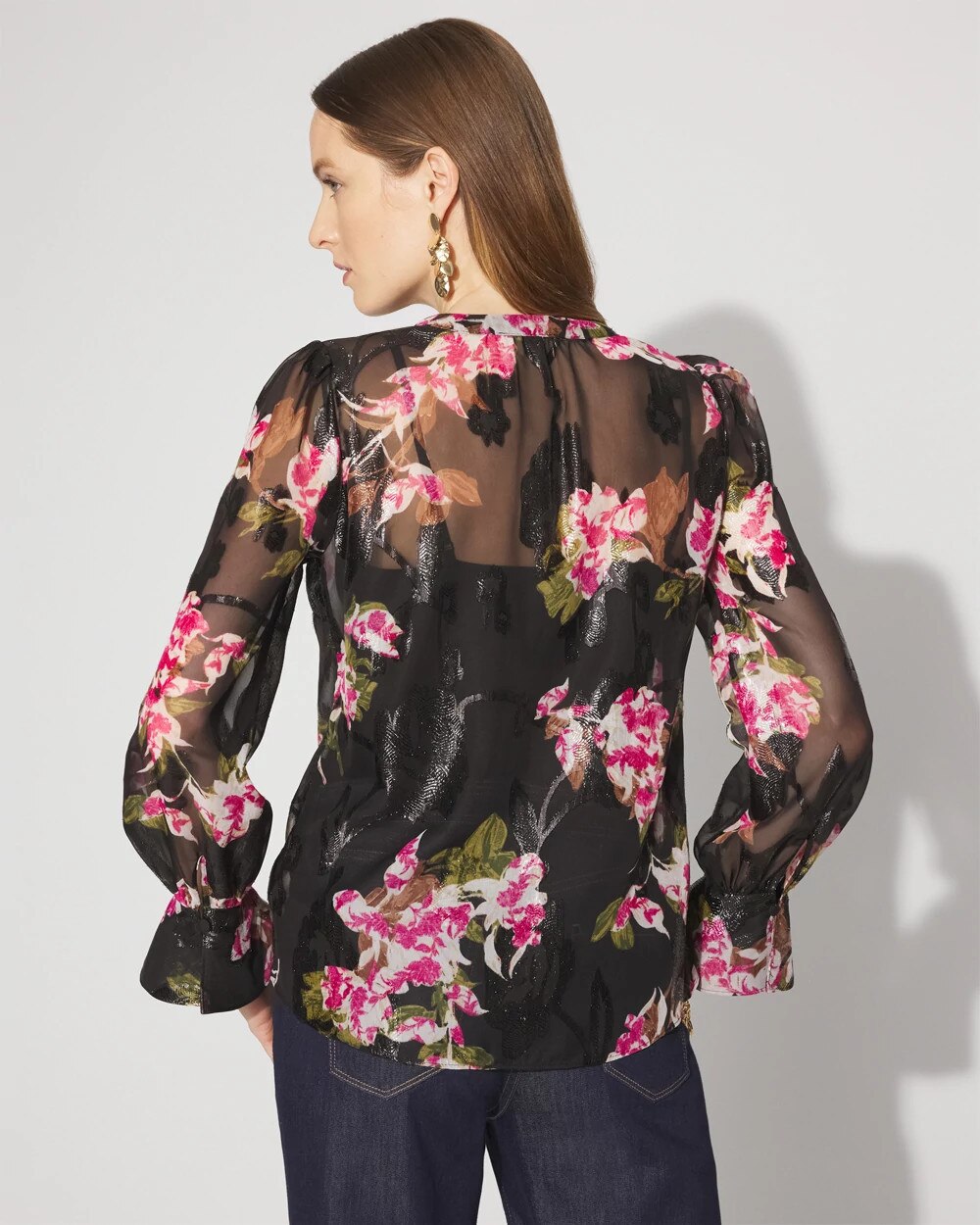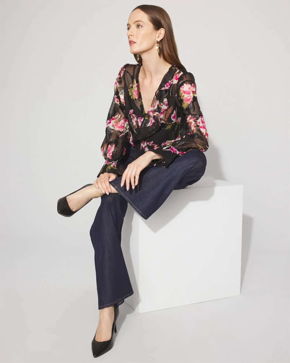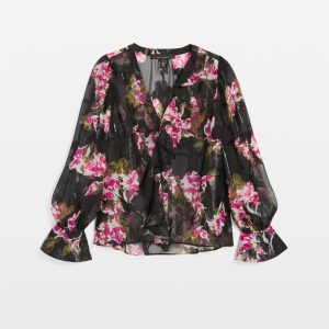 A romantic blouse with ruffles cascading down one side of the neck and down the front, with flounce cuffs. A metallic clip throughout gives you a touch of sheen. This blouse is sheer, so pair it with your favorite WHBM FORME™ or camisole.