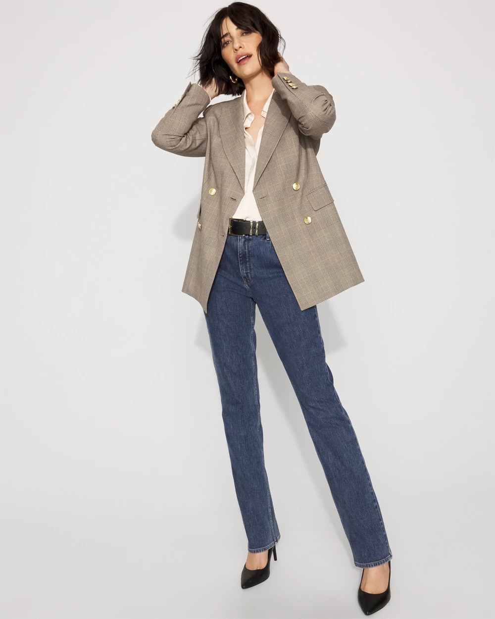 We took inspiration from menswear for this double-breasted blazer in a timeless plaid. This jacket will work just as well with your jeans as it will with pants. We love it with the matching Zoey Plaid Straight Leg Pant and Blazer Midi Dress.