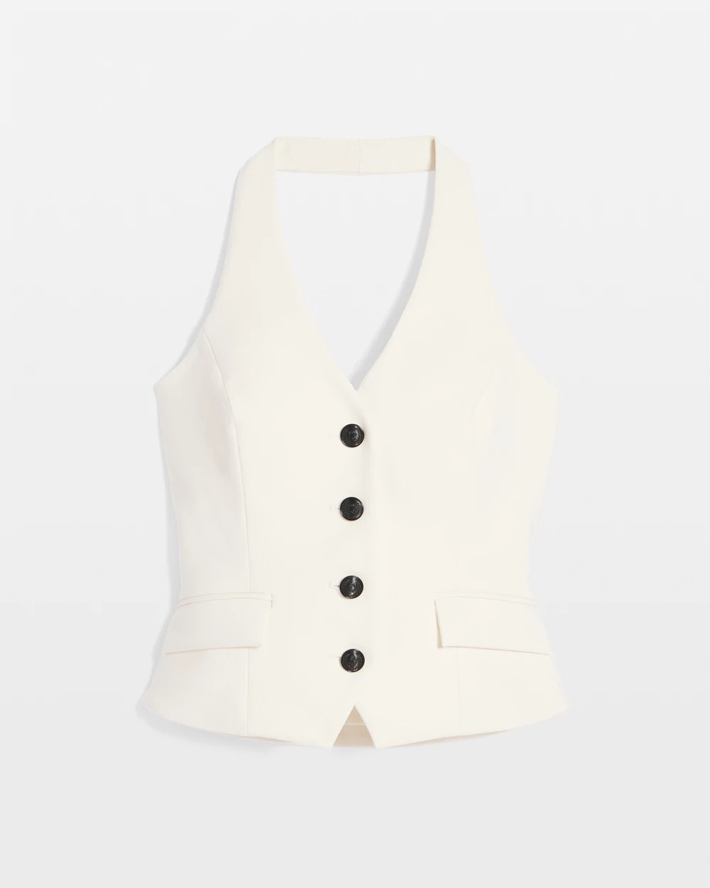Polished enough for work + glam enough for a night out, this vest is crafted from the double weave fabric you love and designed in a classic halter top silhouette. Four contrasting crest buttons add the finishing touch. Pair with our matching Asymmetric Button Front Pencil Skirt or wear it with denim.