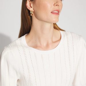 An elbow sleeve sweater with feminine puff sleeve details and a pointelle stitch pattern. Ribbed cuffs and hem finish the look. A perfect transitional piece to pair with your favorite jeans.