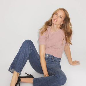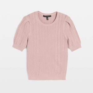 An elbow sleeve sweater with feminine puff sleeve details and a pointelle stitch pattern. Ribbed cuffs and hem finish the look. A perfect transitional piece to pair with your favorite jeans.