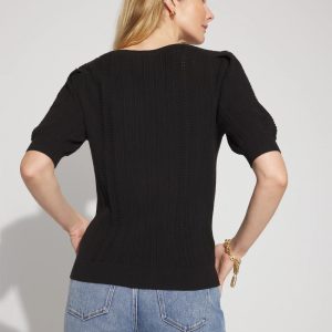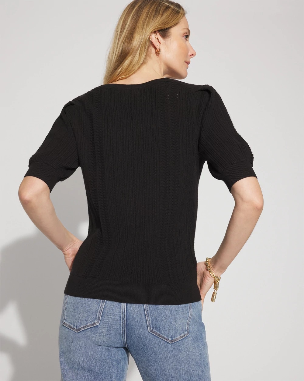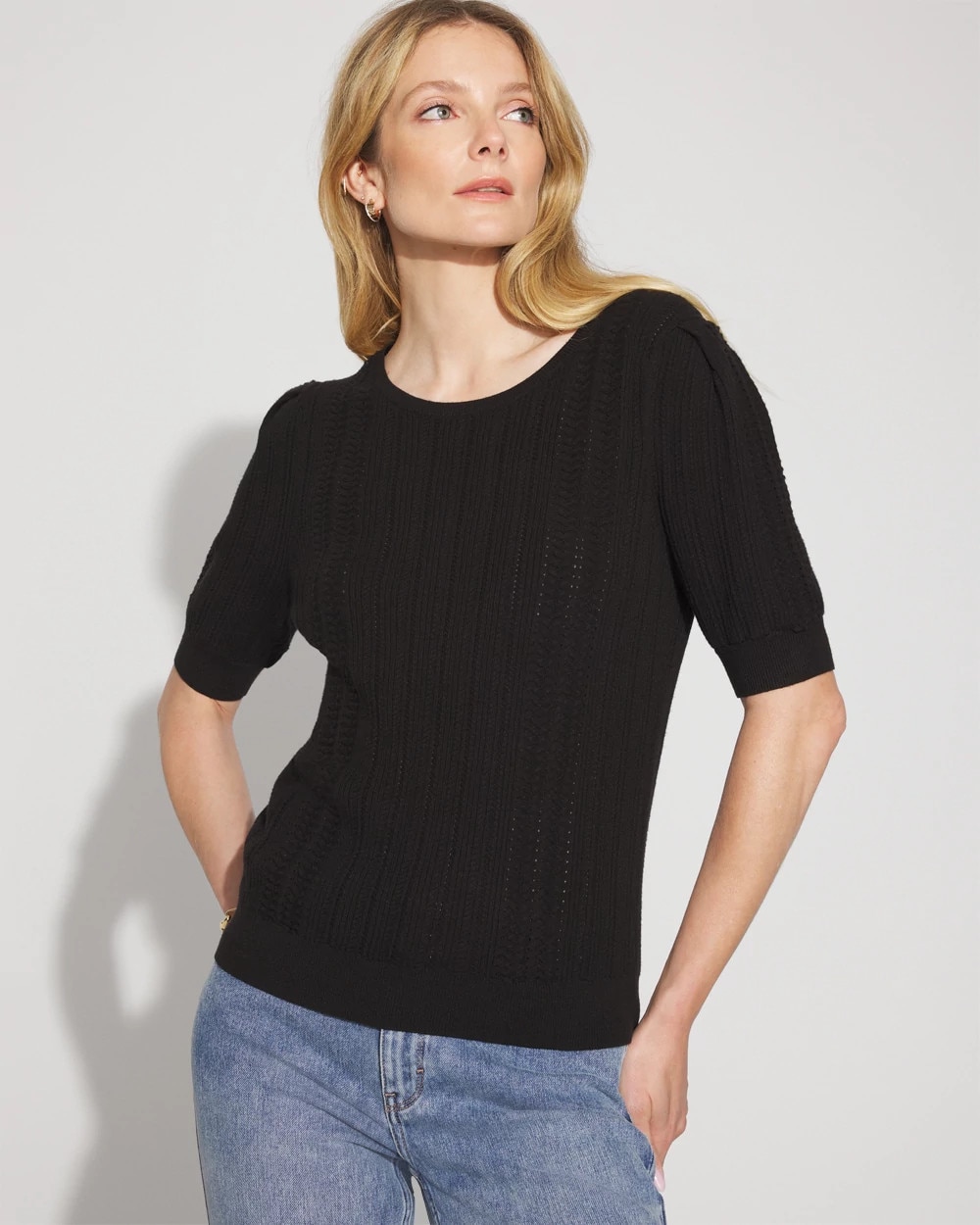 An elbow sleeve sweater with feminine puff sleeve details and a pointelle stitch pattern. Ribbed cuffs and hem finish the look. A perfect transitional piece to pair with your favorite jeans.