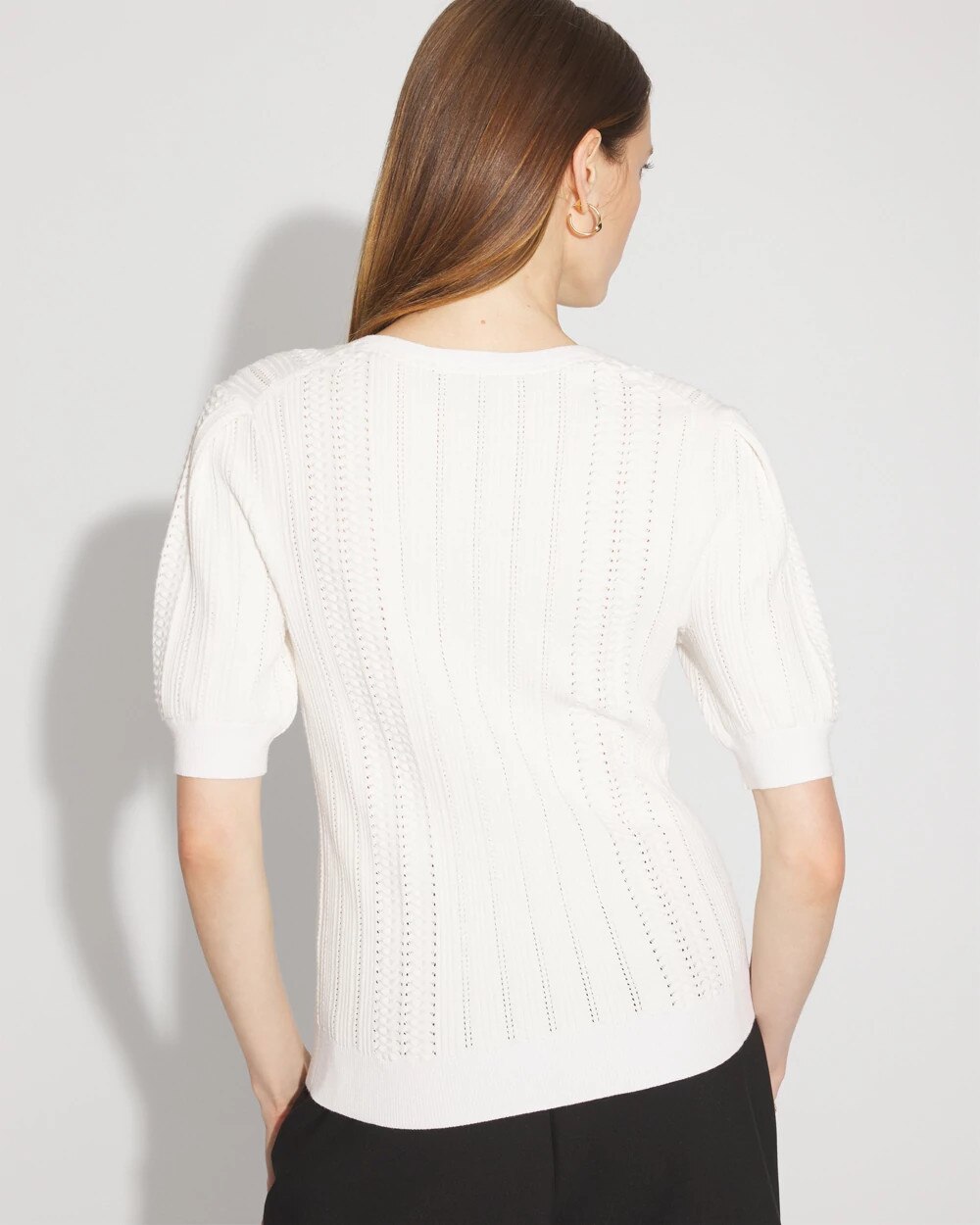 An elbow sleeve sweater with feminine puff sleeve details and a pointelle stitch pattern. Ribbed cuffs and hem finish the look. A perfect transitional piece to pair with your favorite jeans.
