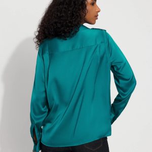 You’ll love this utility shirt with a relaxed fit, yet made from satin for an elevated look. Designed with faux front pockets + button closure.