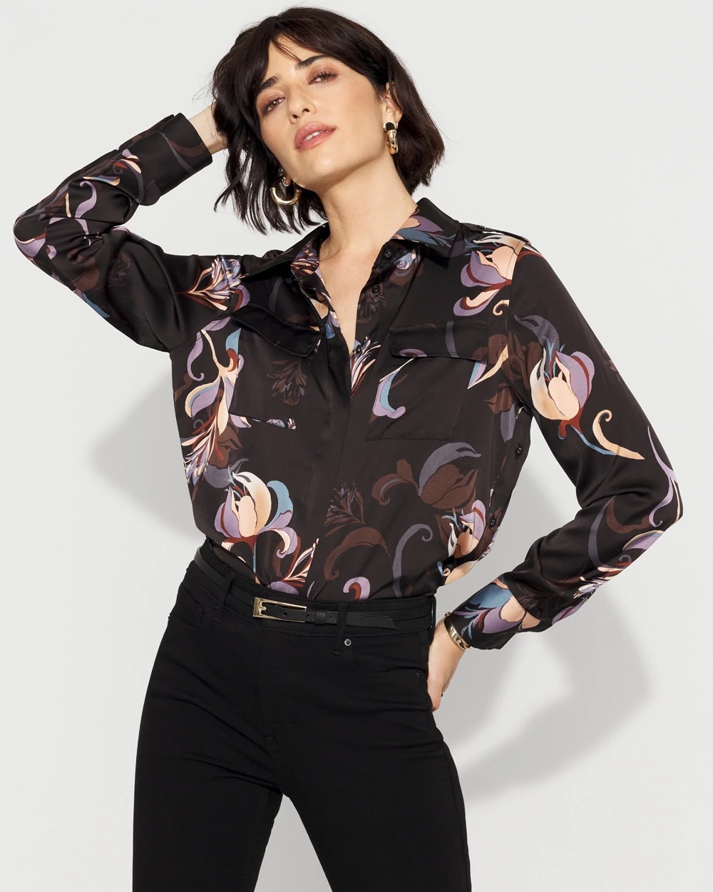 You’ll love this utility shirt with a relaxed fit, yet made from satin for an elevated look. Designed with faux front pockets + button closure.
