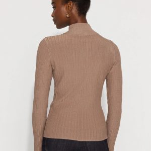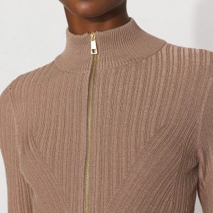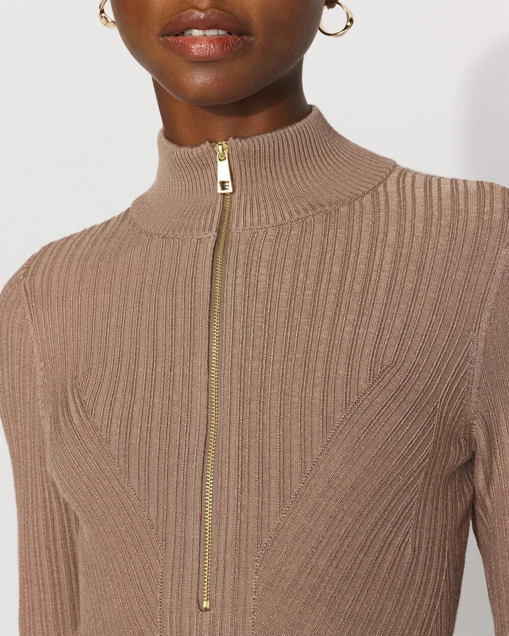 Elevate your casual outfits with this chic, fitted ribbed knit mock neck sweater. The soft gold half-zipper adds a touch of shine.