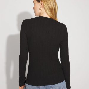 A variegated rib pattern and soft gold buttons elevate this timeless Henley. Wear it with your favorite jeans.