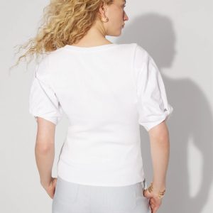 This fitted tee has a soft Pima cotton ribbed body with stretch. The poplin puff sleeve provides contrast and has a twist detail. A dressy t-shirt that will elevate your jeans and shorts.
