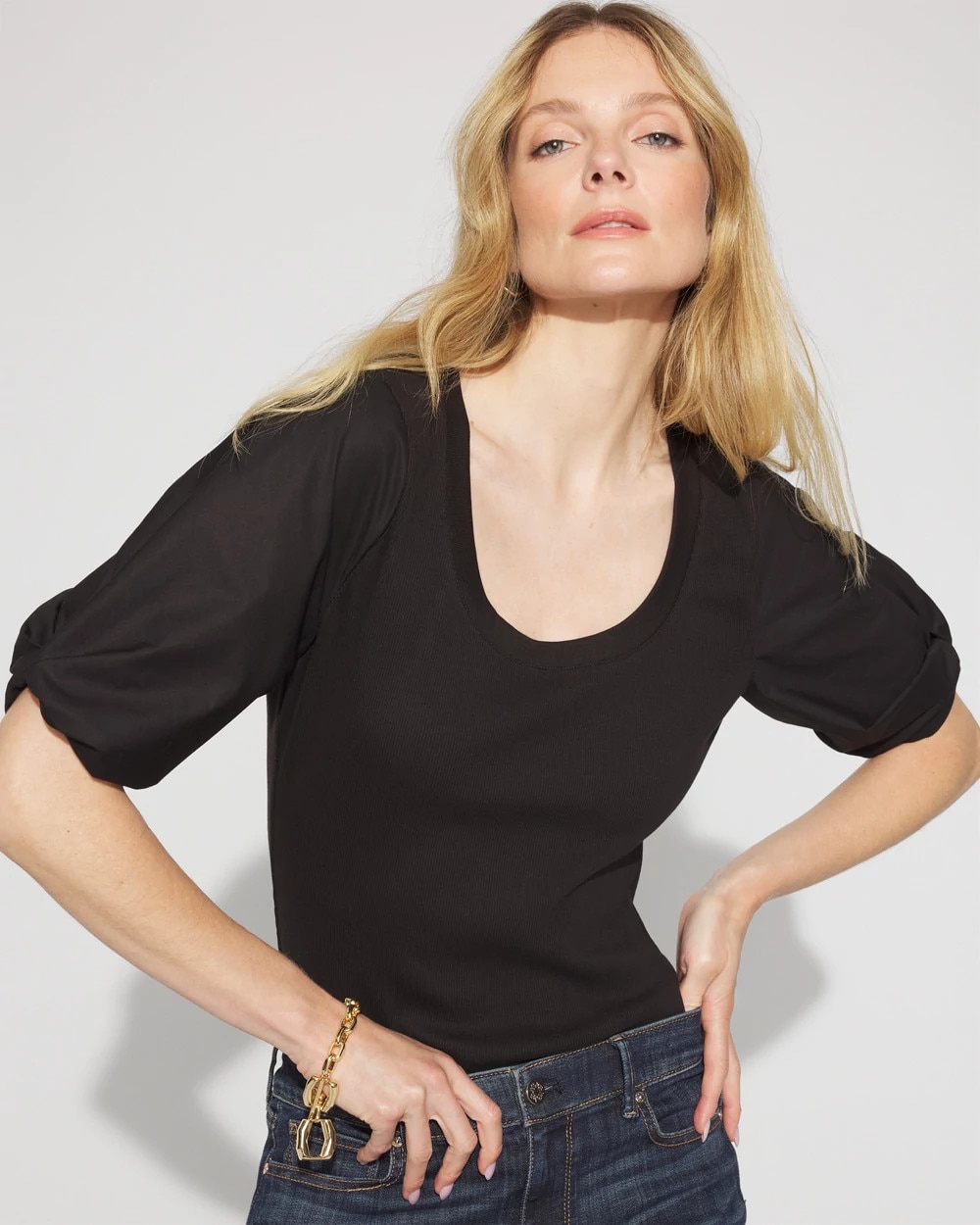 This fitted tee has a soft Pima cotton ribbed body with stretch. The poplin puff sleeve provides contrast and has a twist detail. A dressy t-shirt that will elevate your jeans and shorts.