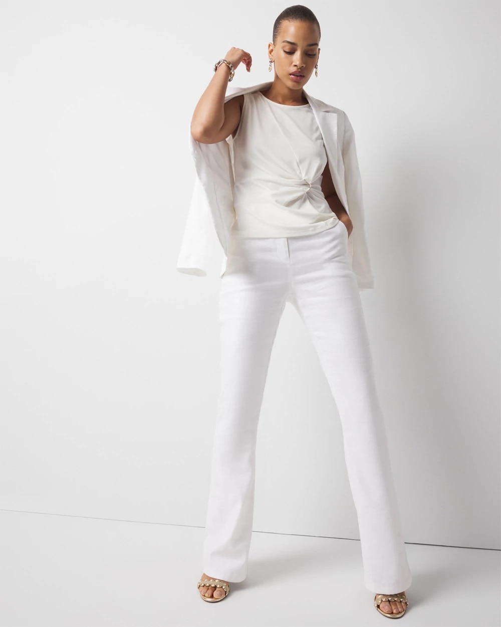 Made from a refined stretch crepe fabric, this fashion tee is gathered at the waist with ring hardware for an elevated look. A dressy tank to layer under a blazer for the office.