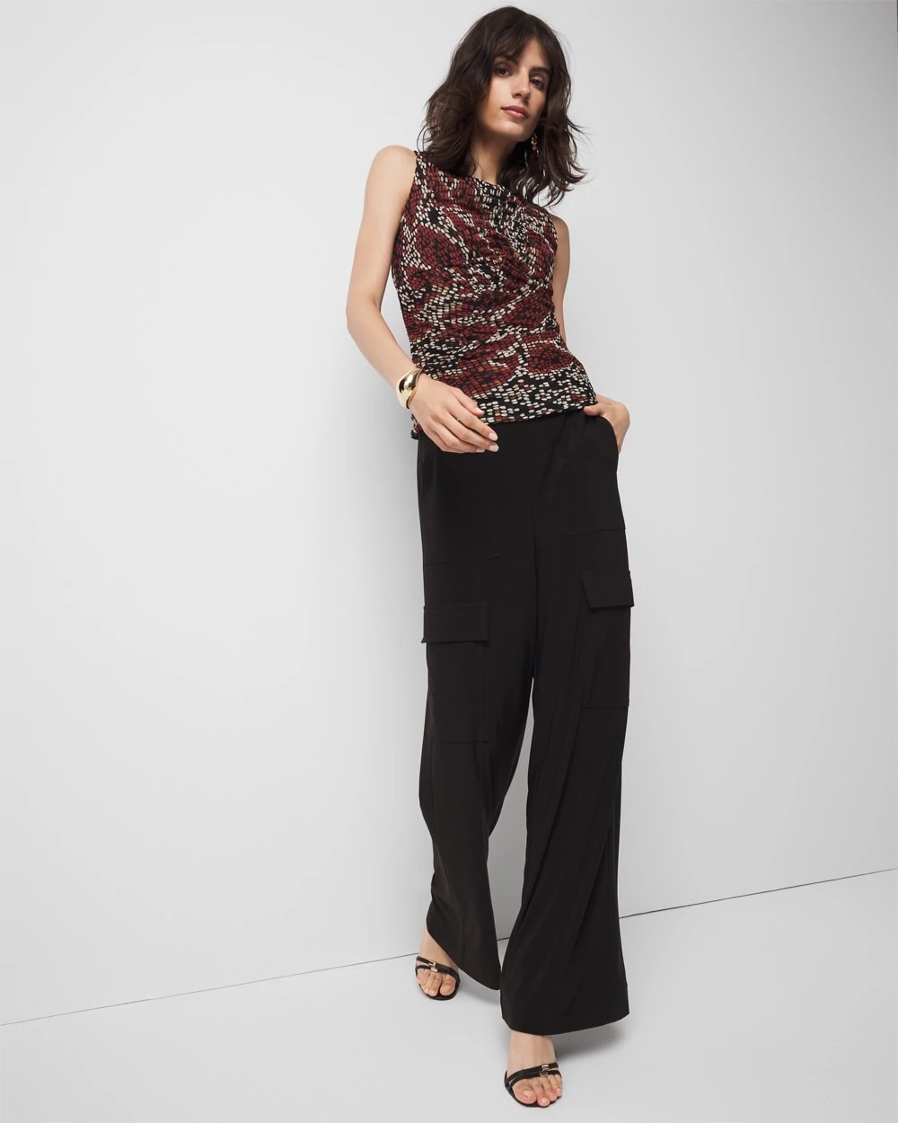 Asymmetric ruching down the front and back give this mesh tank top a fitted + flattering look. It is also lined for coverage.