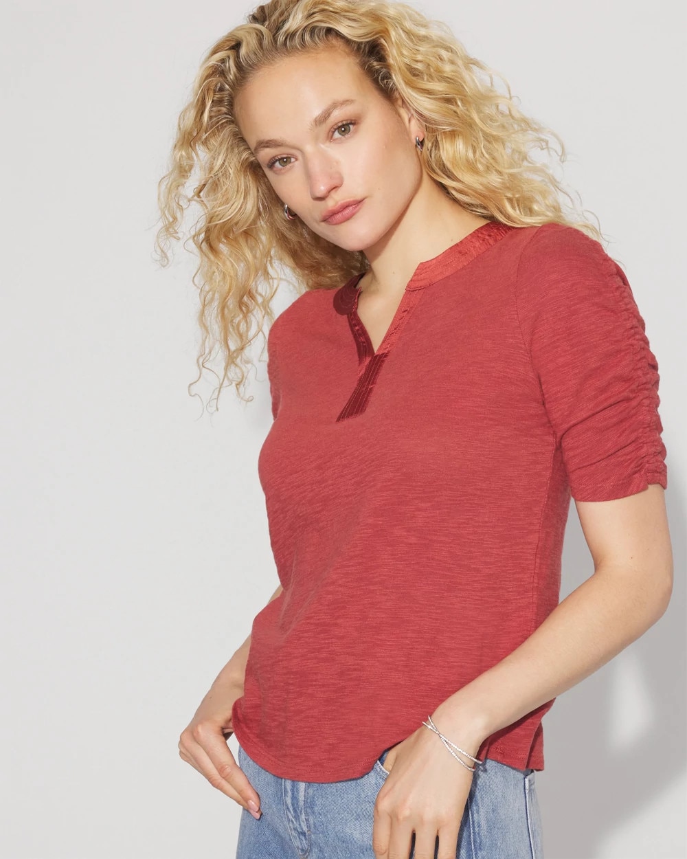 A classic cotton and modal slub tee gets a style update with ruched elbow sleeves and a notched neck. An easy, polished casual tee to pair with your favorite jeans.
