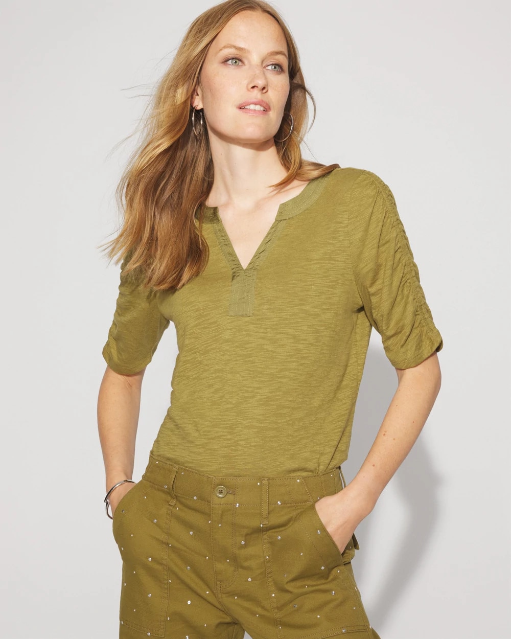 A classic cotton and modal slub tee gets a style update with ruched elbow sleeves and a notched neck. An easy, polished casual tee to pair with your favorite jeans.