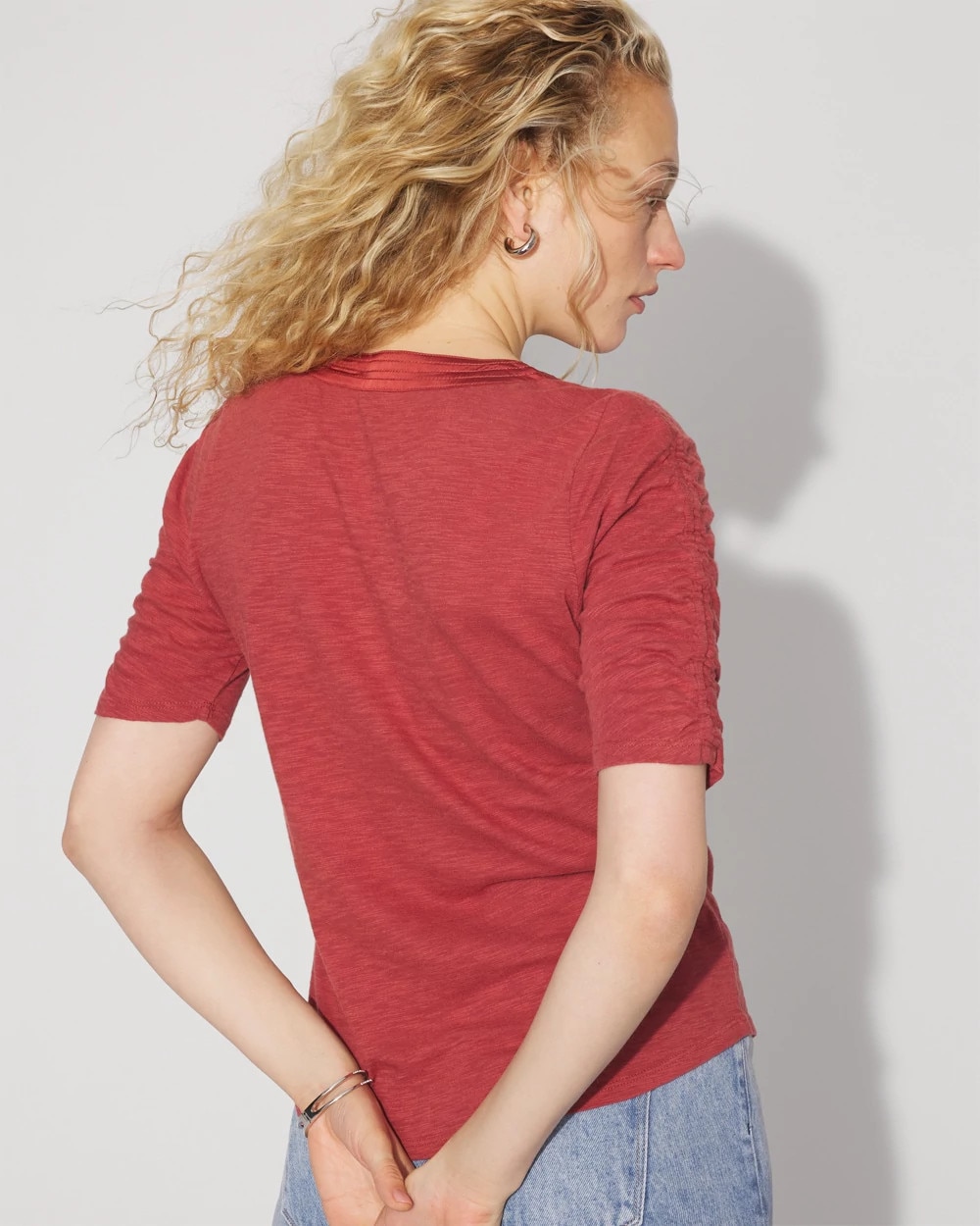 A classic cotton and modal slub tee gets a style update with ruched elbow sleeves and a notched neck. An easy, polished casual tee to pair with your favorite jeans.