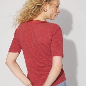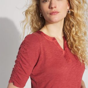 A classic cotton and modal slub tee gets a style update with ruched elbow sleeves and a notched neck. An easy, polished casual tee to pair with your favorite jeans.