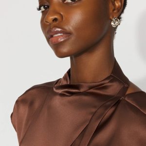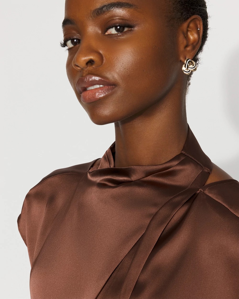 A twist detail at the neck and extended sleeve caps elevate this satin shell. The crewneck in front becomes an open back. A polished top that will becomes a work wardrobe staple.