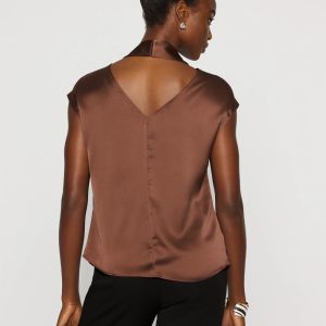 A twist detail at the neck and extended sleeve caps elevate this satin shell. The crewneck in front becomes an open back. A polished top that will becomes a work wardrobe staple.