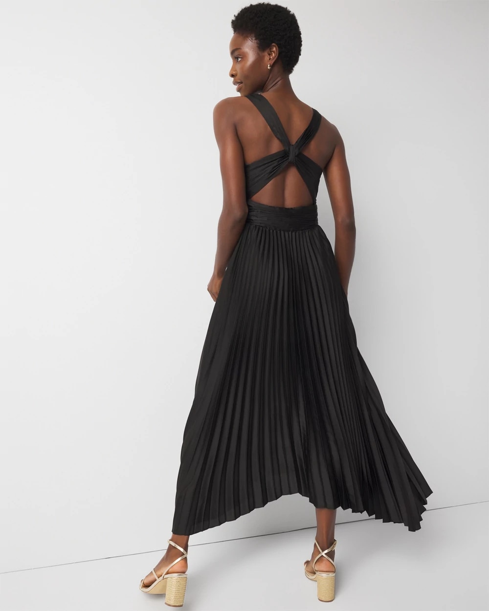 Glam up for summer wedding season with this fully pleated dress that has a sexy crossover back with a cutout and a shark bite hem. Wear with strappy high heel shoes or sandals.