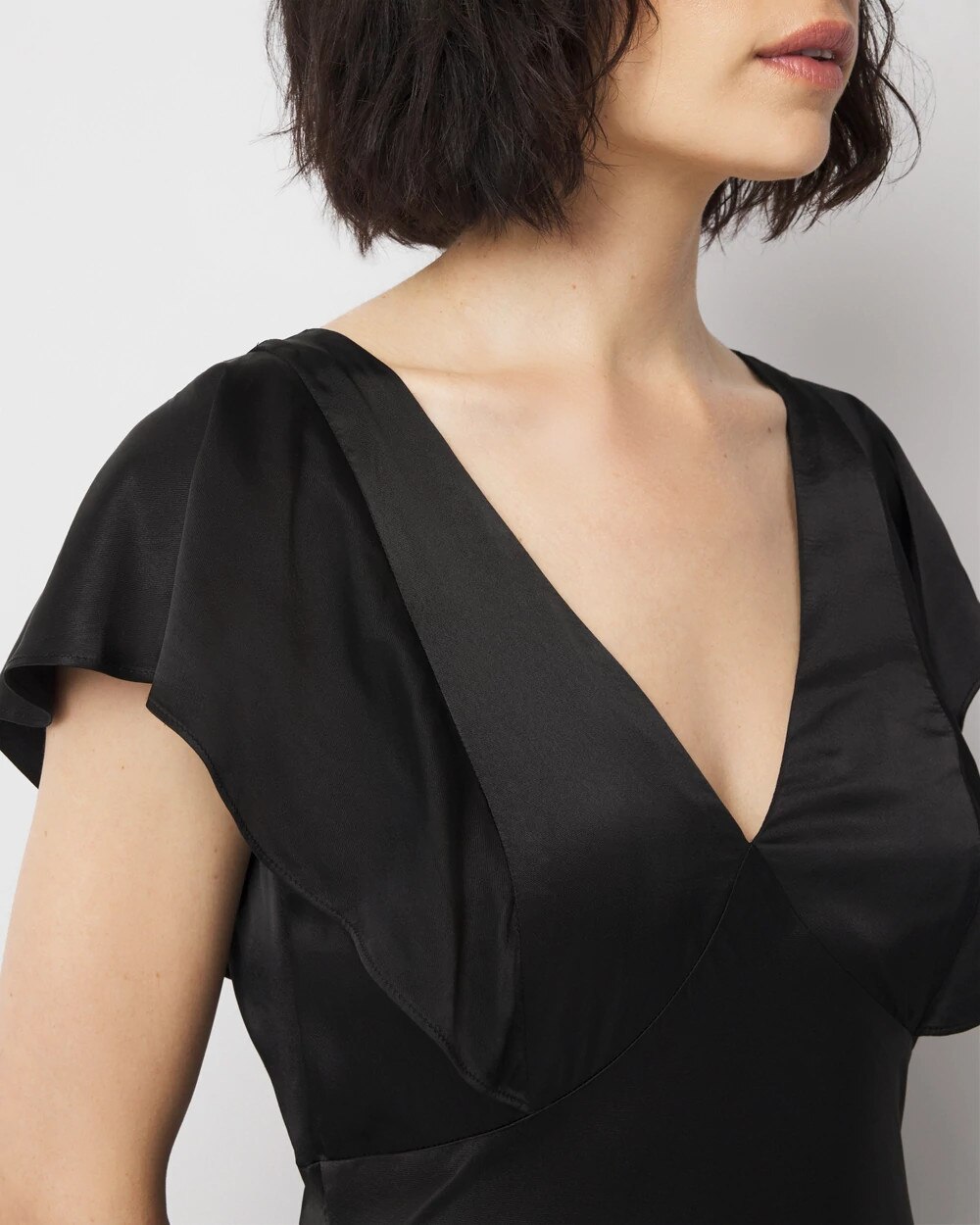 This satin slip dress is cut on the bias with a plunging V in front and back and flutter sleeves. Dressy, feminine and timeless, it’s an easy look for summer nights.