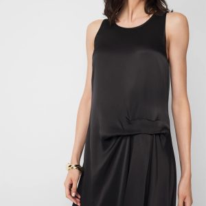 Made from sleek satin with just the right amount of sheen, this tank dress gets an elevated style update thanks to draping at the waist to flatter your shape. This dress has an asymmetric hemline, an invisible back zipper and keyhole at the back of the neckline.
