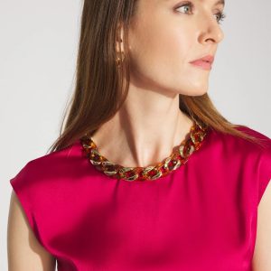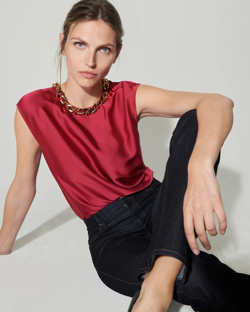 Accessorizing got you stressed out? We’ve designed this satin shell with you in mind. You’ll love the pleats on the wearer’s left for a flattering fit, but you’ll buy this top for the attached faux tortoise and gold chain necklace that give you the ultimate in easy dressing. And yes, it’s washable.