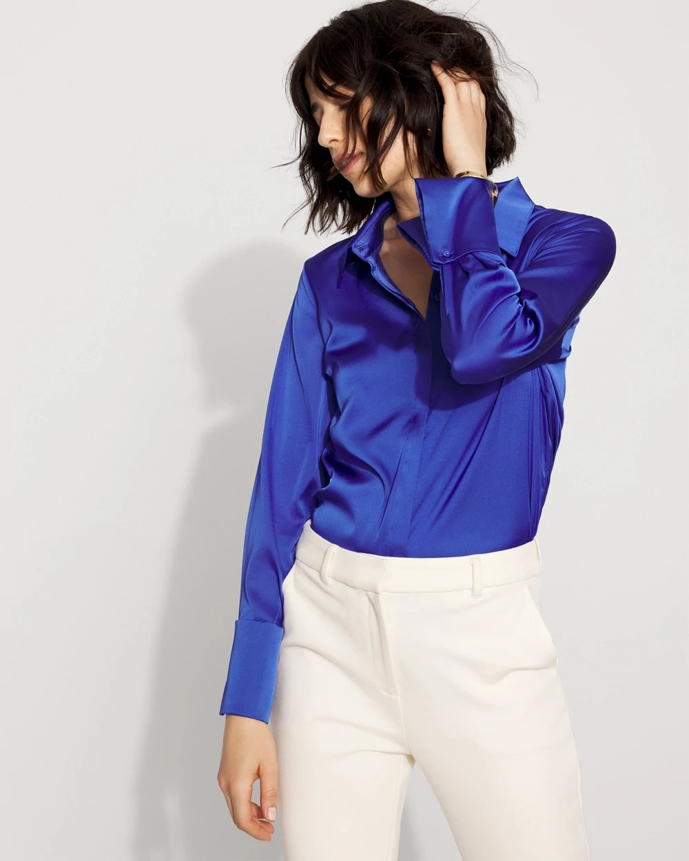 A tuxedo version of our bestselling Soft Shirt made from sleek satin and designed with French cuffs. We’ve tested it under jackets and blazers and it’s a perfect pairing. Hidden button closure and button cuffs.