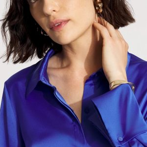 A tuxedo version of our bestselling Soft Shirt made from sleek satin and designed with French cuffs. We’ve tested it under jackets and blazers and it’s a perfect pairing. Hidden button closure and button cuffs.