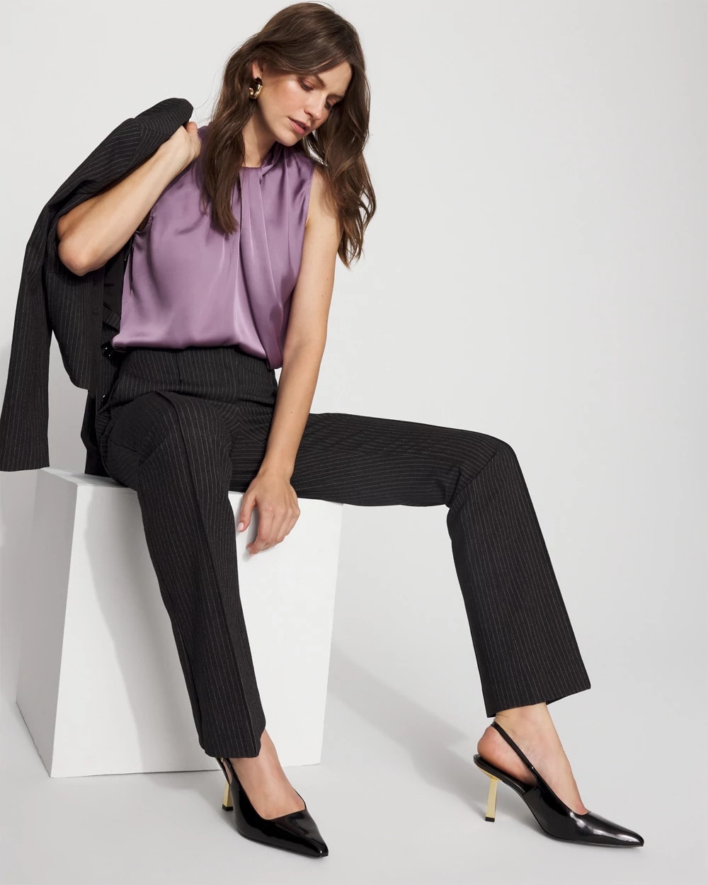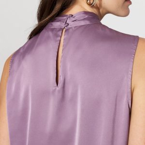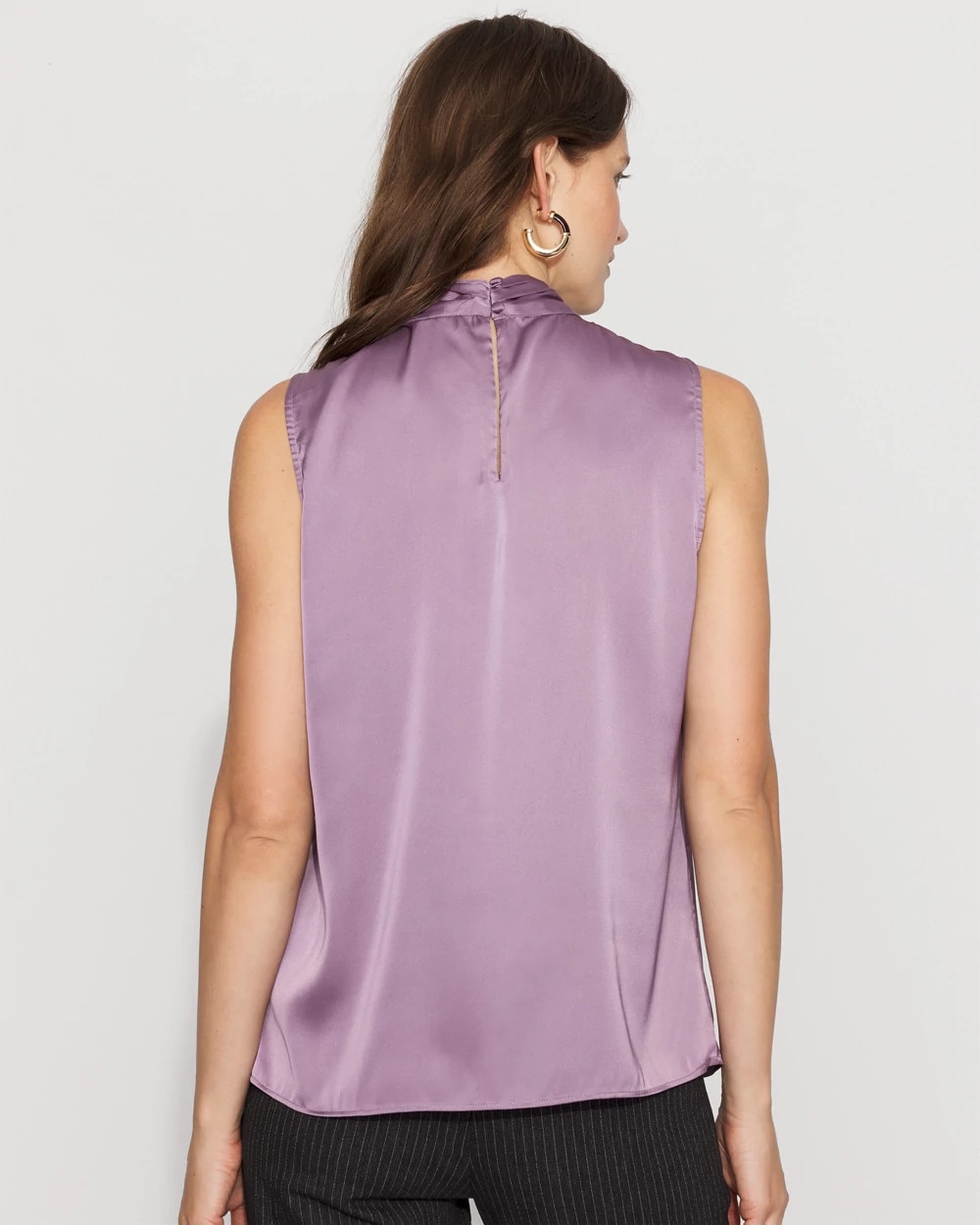 Our sleeveless shells are a workwear fan favorite; this latest edition is made from sleek satin with a twist neck detail. Wear this top under jackets and blazers for a polished look.