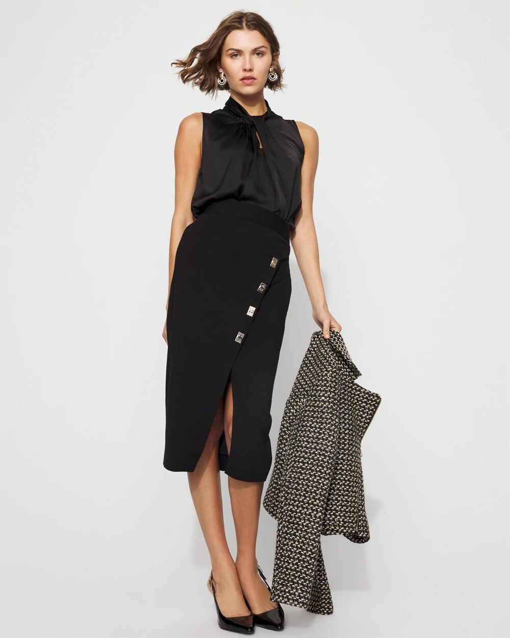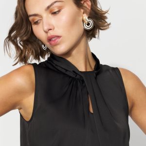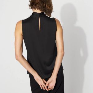 Our sleeveless shells are a workwear fan favorite; this latest edition is made from sleek satin with a twist neck detail. Wear this top under jackets and blazers for a polished look.