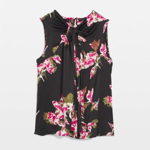 This satin printed shell has a fabric twist at the neckline which adds a touch of flair under a blazer or on its own. A simple piece that will enhance your office wear.