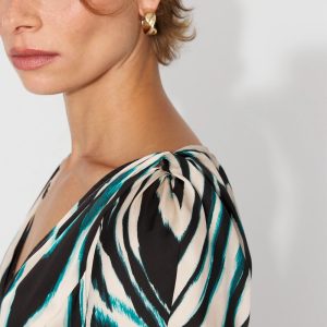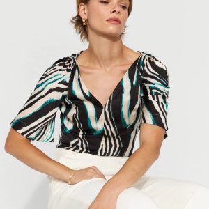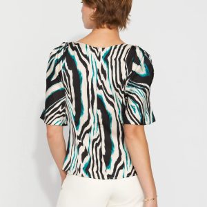 The combination of sleek satin and stylish twist details at the shoulder elevate this short-sleeve top. A wonderful addition to your office looks, it will also dress up denim.