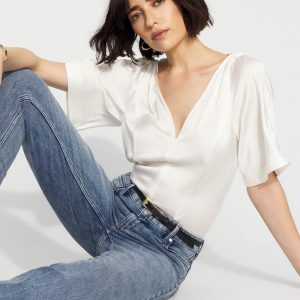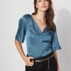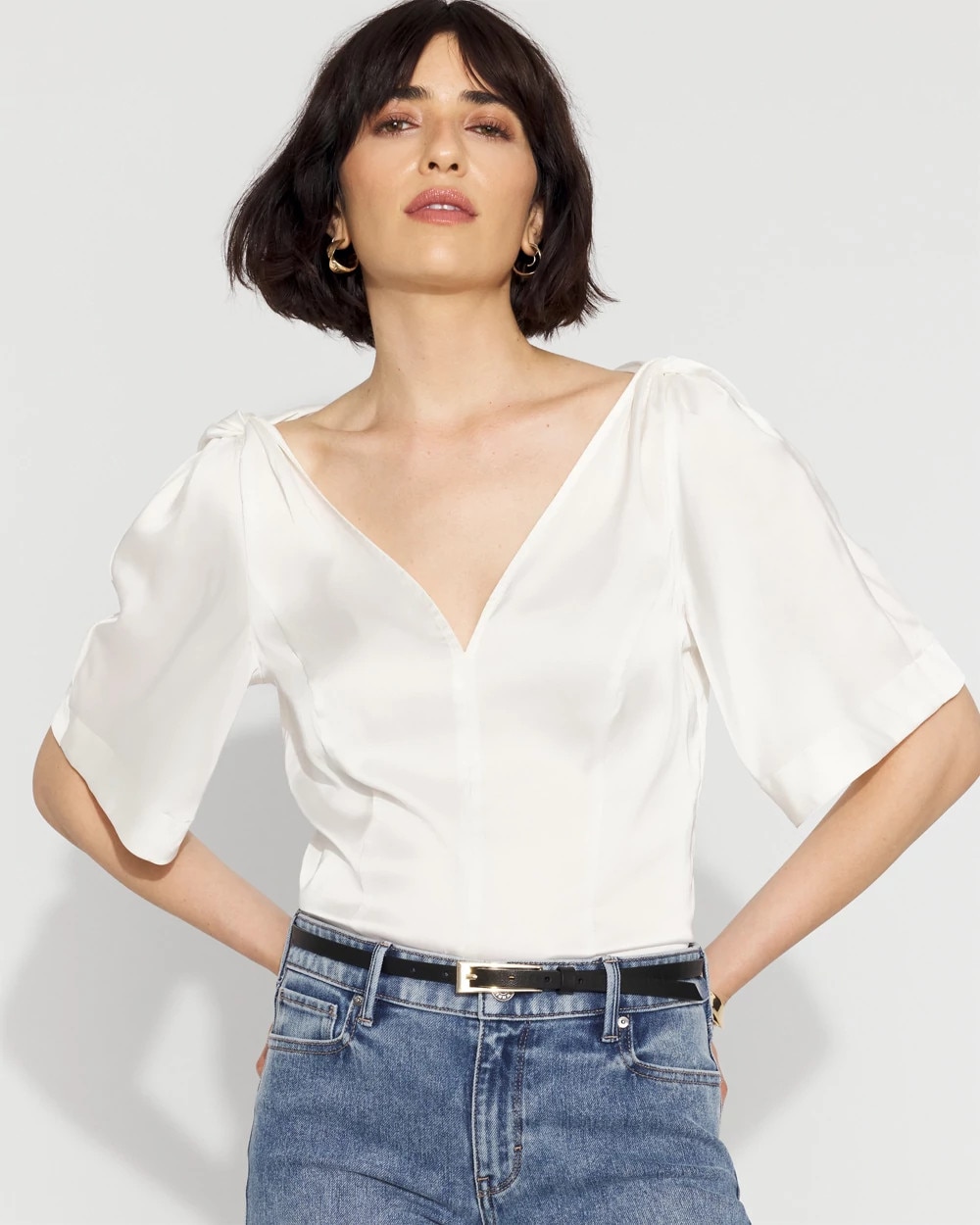 The combination of sleek satin and stylish twist details at the shoulder elevate this short-sleeve top. A wonderful addition to your office looks, it will also dress up denim.
