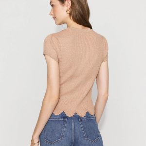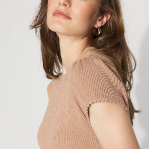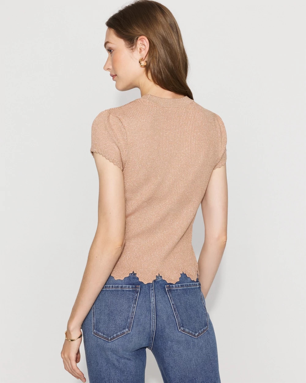 Knit from a metallic yarn for a chic shimmer, this short cap sleeve sweater has a scalloped hem and cuff, giving it a feminine + romantic look.