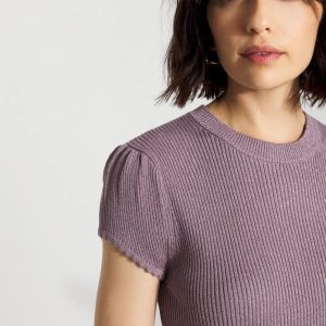 Knit from a metallic yarn for a chic shimmer, this short cap sleeve sweater has a scalloped hem and cuff, giving it a feminine + romantic look.