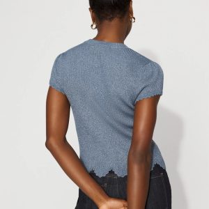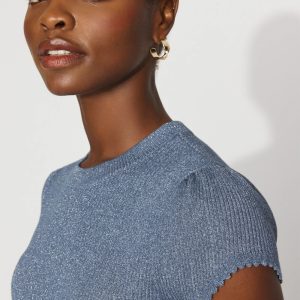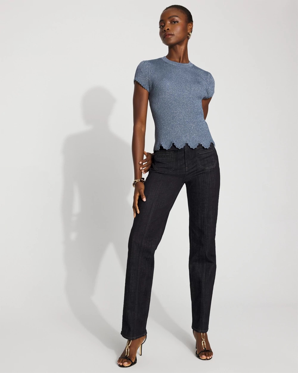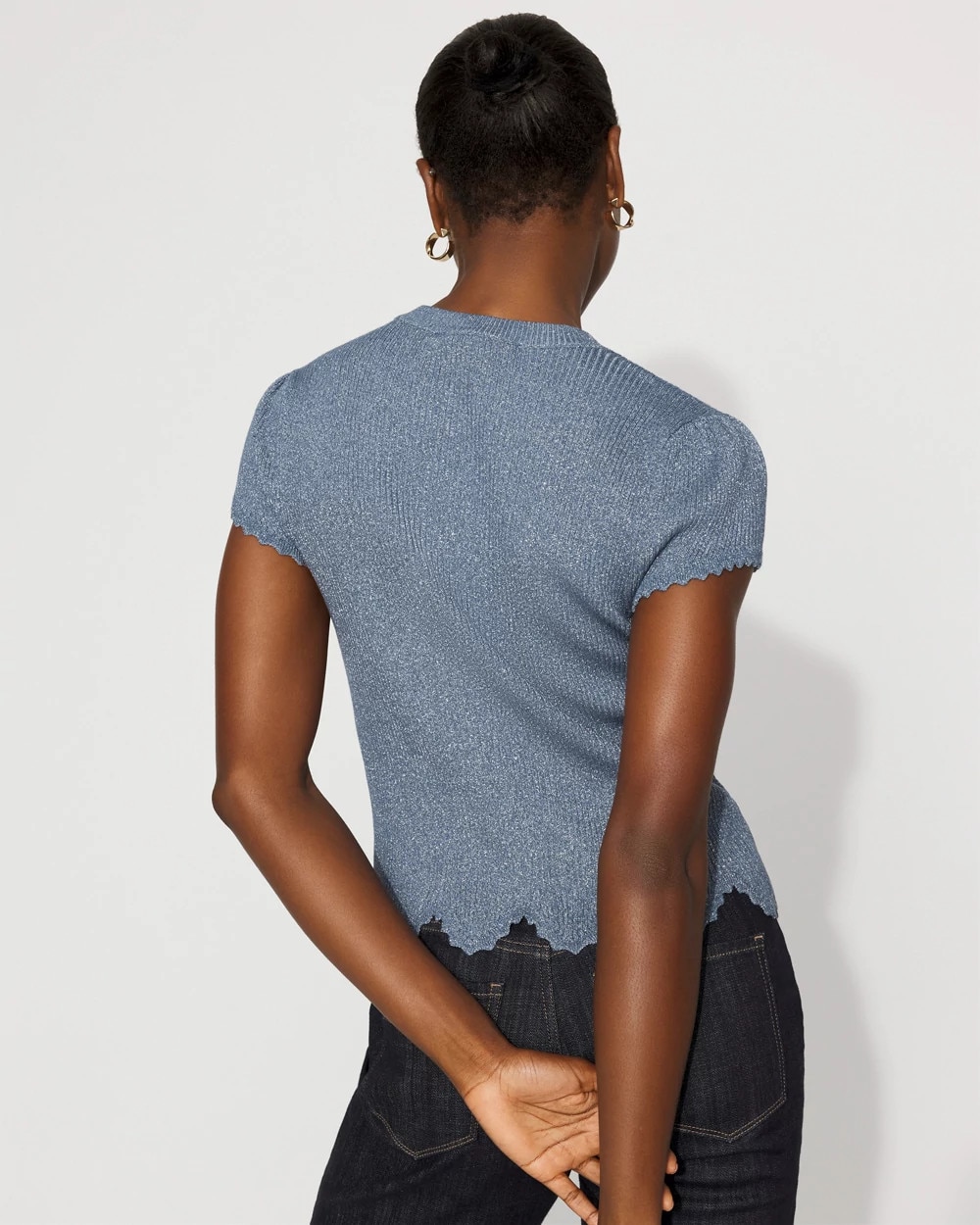 Knit from a metallic yarn for a chic shimmer, this short cap sleeve sweater has a scalloped hem and cuff, giving it a feminine + romantic look.