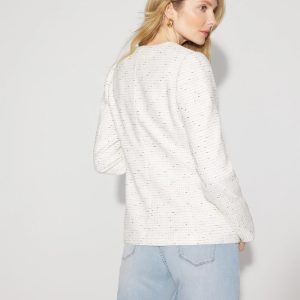 A touch of silver lurex adds subtle sheen to this polished tweed blazer. We’ve designed it with a scoop neck for a modern take on the classic tweed jacket which makes wearing a statement necklace an easy option. Contrasting black crest buttons finish the look of this refined jacket.